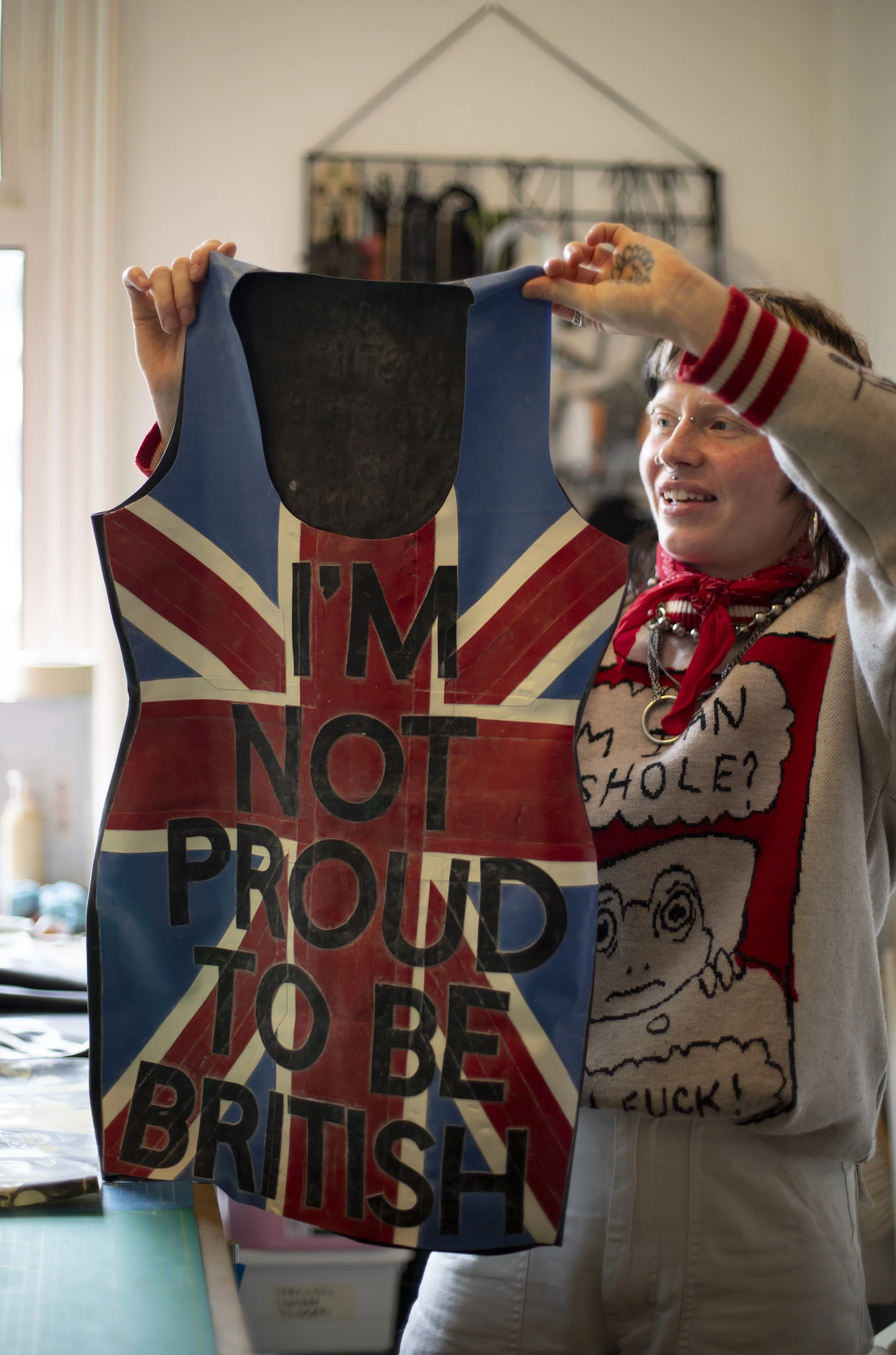 Looking through pieces in their studio myself and our photographer Appoline fawned over a latex dress with a union jack on it and the words ‘NOT PROUD TO BE BRITISH’, whilst Amy mentioned wishing they could make more explicitly political work. I had to ask at that point – ‘isn’t all latexwear political? I think all your clothes feel very explicit in that’