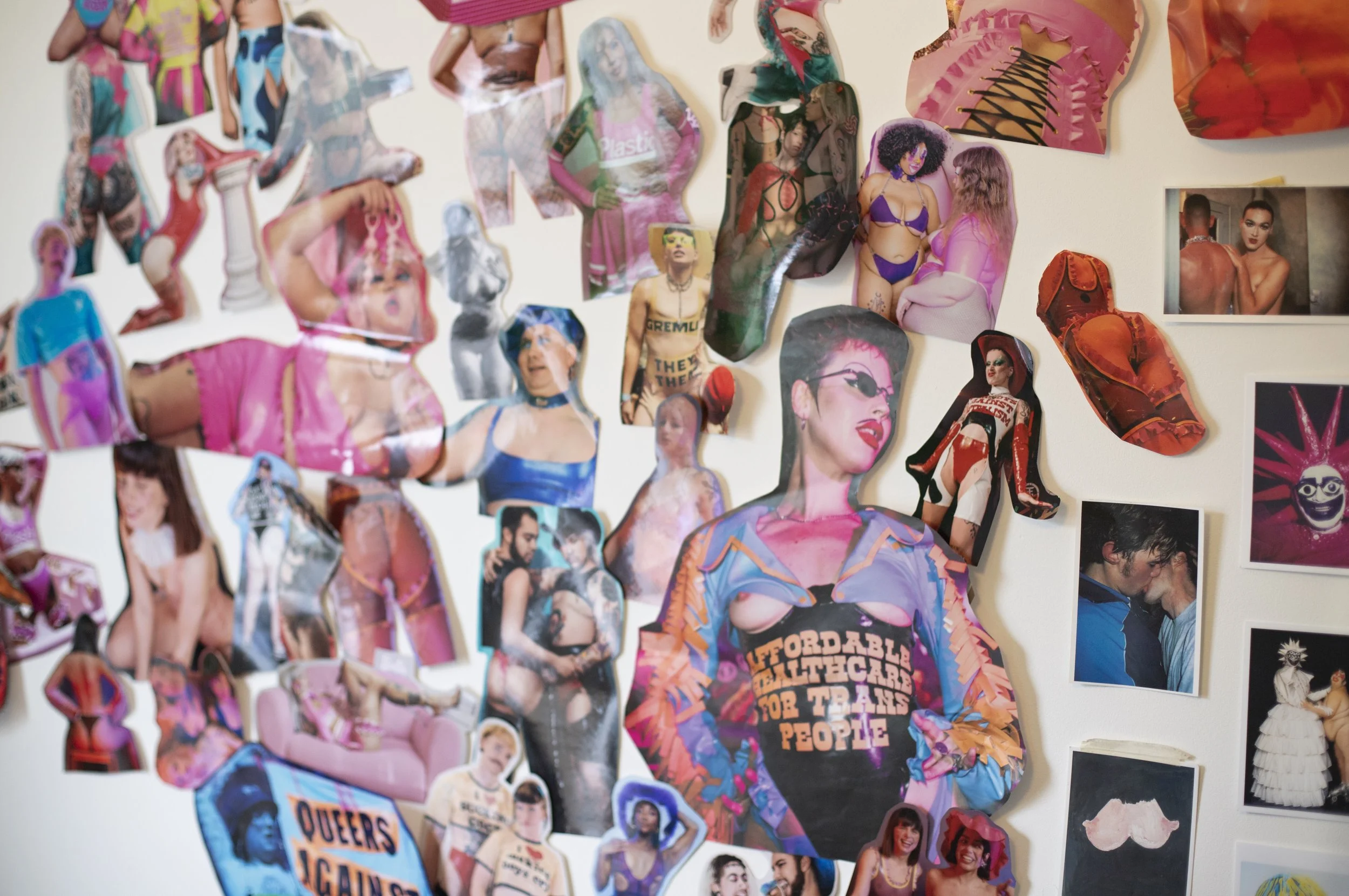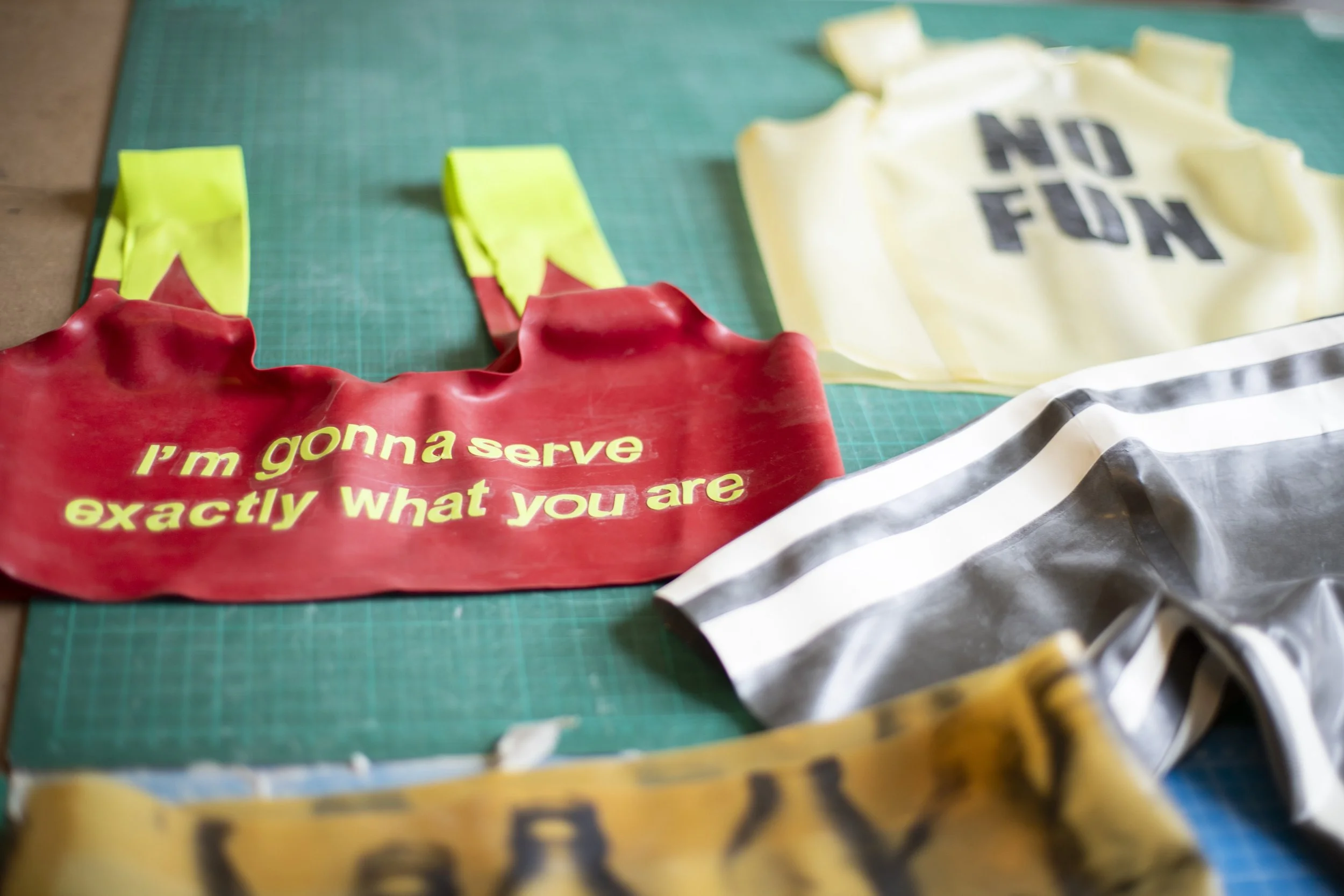 But the studio space brought me to another question. With screen printed pieces hanging on the wall, a huge mural-come-collage of grinning customers in their frilly, colourful latex and a work-in-progress in hot pink on the cutting table. Latex has historically been black on black on black, as Amy mentioned in our conversation, and some kink spaces were also very serious – you had to wear the right things and attend the right events, how did this material become such a space for expression for them?